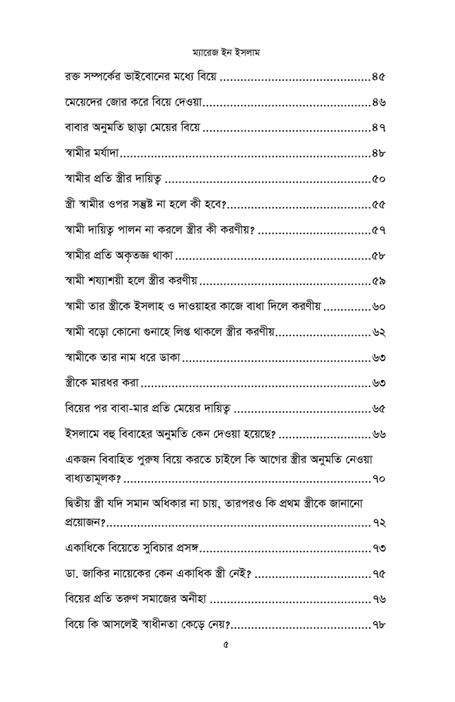 ম্যারেজ ইন ইসলাম। বইটি লেখা হয়েছে বিয়ে বিষয়ে ডা. জাকির নায়েকের লেকচার থেকে। এতে স্থান পেয়েছে বিয়ে, জীবনসঙ্গী নির্বাচন, নিকাহ, বা বিয়ে পরবর্তী জীবন কীভাবে কাটাবেন সে সম্পর্কে বিস্তর আলোচনা। এককথায় বিয়েতে রাজি হওয়া বা কবুল বলার আগে এবং বিয়েতে রাজি হওয়া বা কবুল বলার পর যে প্রশ্নগুলো আসতে পারে সেগুলো সম্পর্কে, যাতে বিবাহিত দম্পতির জীবন কুরআন-হাদিস অনুযায়ী হয়।