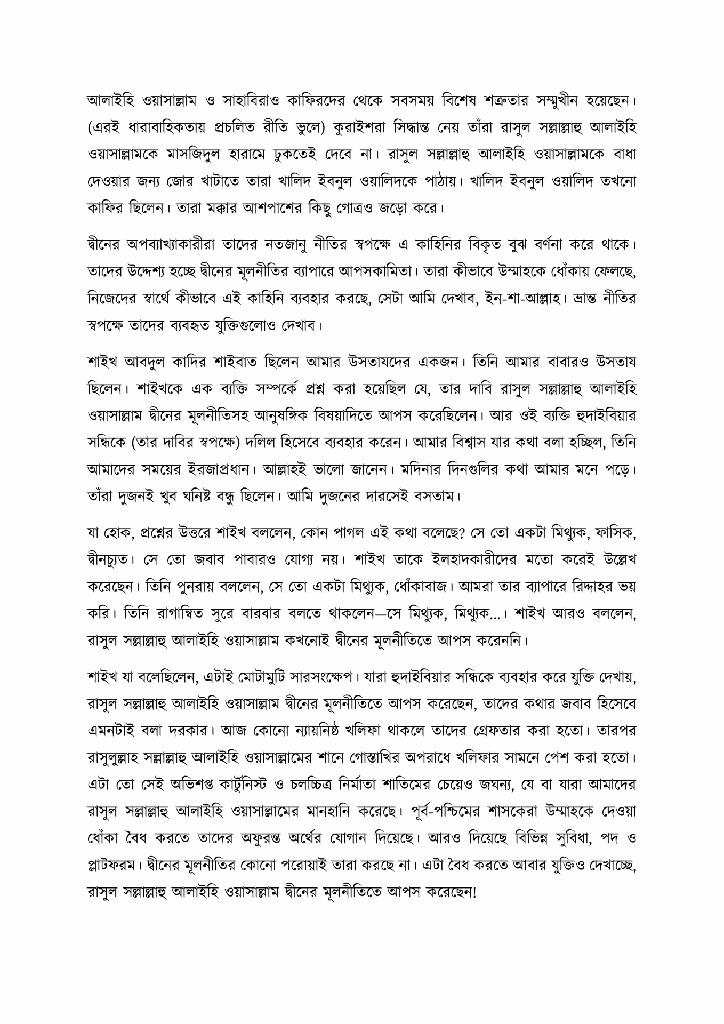 ঐতিহাসিক ‘হুদাইবিয়ার সন্ধি’—কুরআনুল কারিমে যাকে আখ্যা দেওয়া হয়েছে ‘সুস্পষ্ট বিজয়’ নামে। একটি প্রতিষ্ঠিত জোট, সমাজ, রাষ্ট্র ও জীবনব্যবস্থার মোকাবিলায় সত্যের ঝান্ডা নিয়ে মদিনায় জন্ম নেওয়া ছোট্ট ও নবীন ইসলামী রাষ্ট্রের আত্মপরিচয়ের ঐতিহাসিক দলিল। সত্যই সুস্পষ্ট বিজয়। মিথ্যার সাথে সত্যের দ্বন্দ্ব। মিথ্যার সামনে সত্যানুসারীদের সিনা টান করে দাঁড়ানোর অনুপ্রেরণা। তবে এর সাময়িক শান্তিচুক্তির ধারা যুগ যুগ ধরে নিজেদের পরাজিত ও আপসকামী মানসিকতার দলিল হিসেবে ব্যবহার করে আসছে বাতিলের সাথে আপসকামীরা। প্রতিকূল পরিস্থিতিতে দ্বীনের খণ্ডিত বয়ান নিয়ে হাজির হওয়া, দ্বীনকে কাটছাঁট করে উপস্থাপন, বাতিলের পছন্দসই পন্থায় ইসলামকে চিত্রায়ণ—আজকাল এমন নানা উপায়ে পরাজিত মানসিকতা ও আপসকামিতার মানহাজকে বৈধপ্রমাণে করা হচ্ছে বিভিন্ন কসরত।তাই এ ঐতিহাসিক সন্ধির হাকিকত নিয়ে ব্যাখ্যামূলক স্বতন্ত্র রচনার যেন একান্তই প্রয়োজন ছিল। আর এ বইটি সেই প্রয়োজন পূরণেরই একটি ছোট্ট প্রয়াস। বইটি মূলত শাইখ আহমাদ মূসা জিবরীলের লেকচার সিরিজ ‘The Treaty of Hudaybiyyah : Falsehood vs Facts’-এর গ্রন্থিত রূপ।